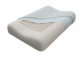 Подушка средней жесткости из материала с «эффектом памяти», имеет эргономическую форму, с двумя валиками под шею одинаковой  высоты и углублением в центре, которое покрыто мягкими округлыми конусами для создания эффекта микромассажа во время сна.  Благодаря этому эффекту улучшается кровоснабжение тканей и ускоряется обменные процессы, что в свою очередь замедляет процесс старения тканей и кожа лица становится более упругой и здоровой.