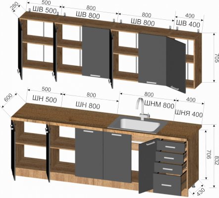 | Высота верхних шкафов, мм | 705 |