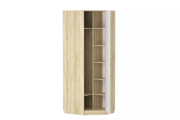 Со шкафом Оливия НМ 014.11 X получится максимально использовать пространство в комнате, задействовав место в углу. Внутри модуль разделен на две функциональные зоны. Секция с пятью полками подходит для хранения одежды в сложенном виде, а на штанге в другой половине шкафа можно разместить одежду на вешалках-плечиках. Две широкие полки, расположенные над и под штангой, удобны для хранения коробок.