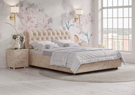 Элегантная интерьерная кровать с изголовьем, украшенным декоративными пуговицами и глубокой пиковкой. Модель изготовлена из ДСП. В комплект кровати входит кроватное основание. Каркас основания выполнен из металла, ламели - из берёзы. При необходимости в комплект можно включить подъемный механизм с бельевым ящиком. Обратная сторона изголовья обита темно-серым спандбондом, но, при желании, её можно выполнить из основного обивочного материала.