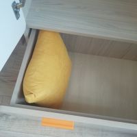 Пришёл в разобранном виде - упаковано отлично. При распаковке минимум запаха и стружки древесной. Сборка своими силами без проблем - все отверстия на месте, крепежа с запасом. Дверные петли с доводчиками, ящик без. В комплекте 2 набора ручек разного цвета (оранжевый и мята). Нижний ящик очень глубокий, 35 см. Из недостатков: белая плёнка, покрывающая фасады, весьма тонкая с шершавой фактурой - напоминает бумагу. Смотрится "по-проще" чем глянцевые фасады. Как будет мыться в дальнейшем тоже не ясно. Но для нас плюсов пока больше чем минусов - и ребёнок и родители довольны.